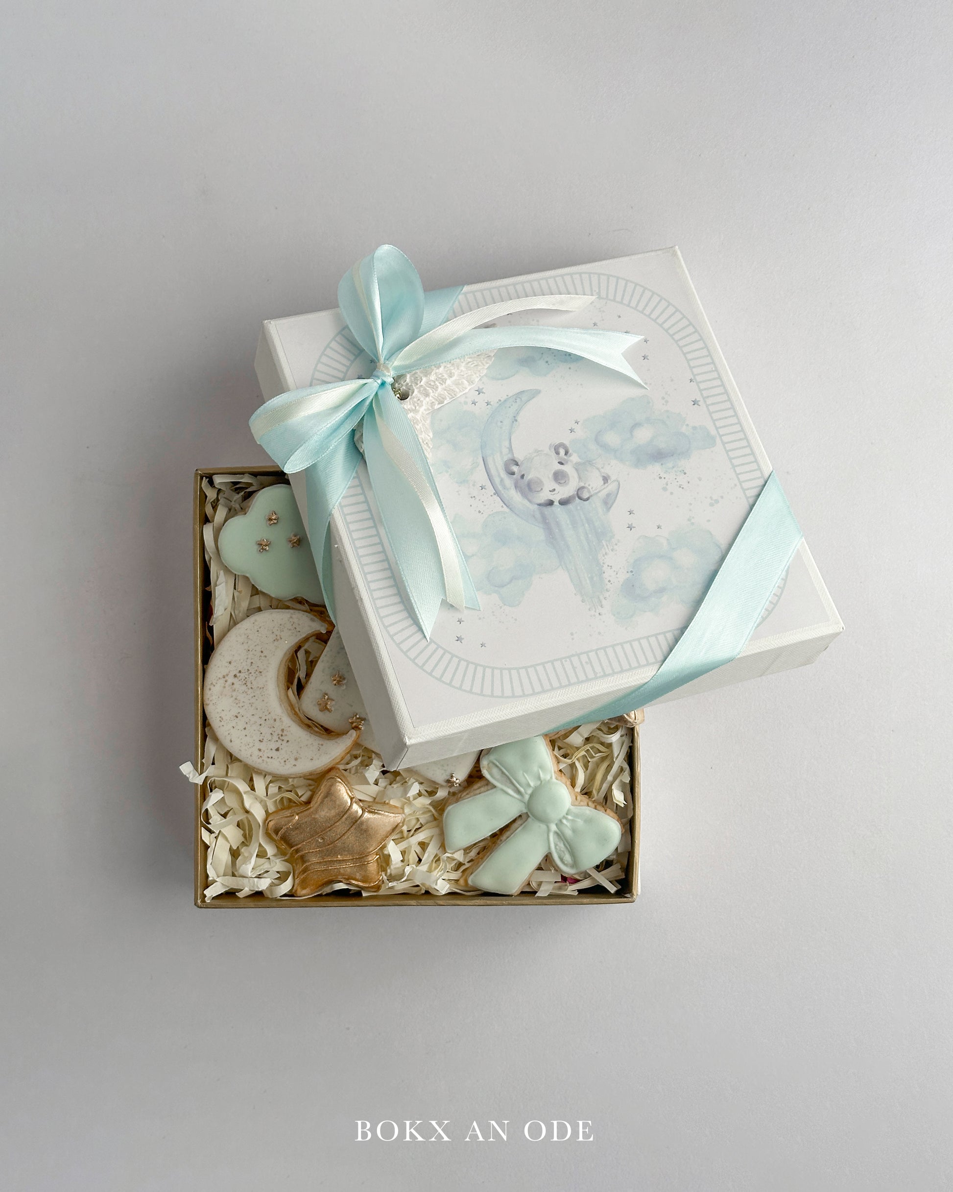 The Cuddle Box is a 7x7 inch keepsake that captures the calm of moonlit skies. Hand-painted in soft hues with a sleepy panda resting among clouds, it’s finished with a satin bow and a delicate wing tag. Thoughtfully designed for baby gifts, keepsakes, or heartfelt tokens, a quiet reminder of love, care, and comfort.