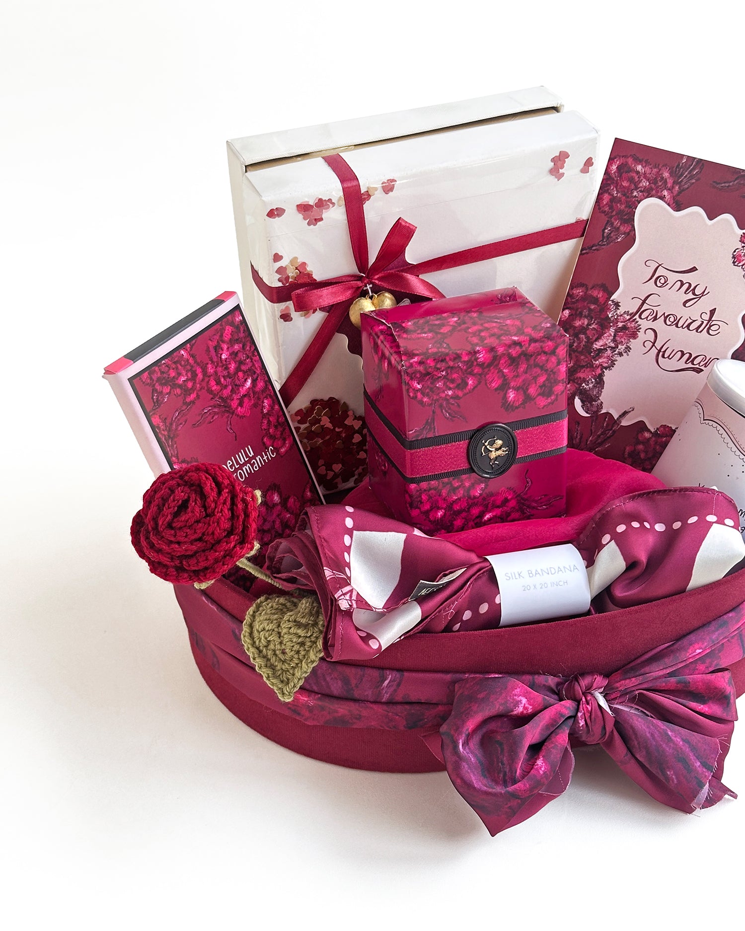 Featuring a box of royal-icing customised sugar cookies, a scented candle by Honey I’m Home Candles, a Lals dark chocolate bar, a premium printed silk square, a crochet rose, a cookie jar by Kitchen Cuisine, and a greeting card — all beautifully arranged in a reusable luxe suede upholstered basket.