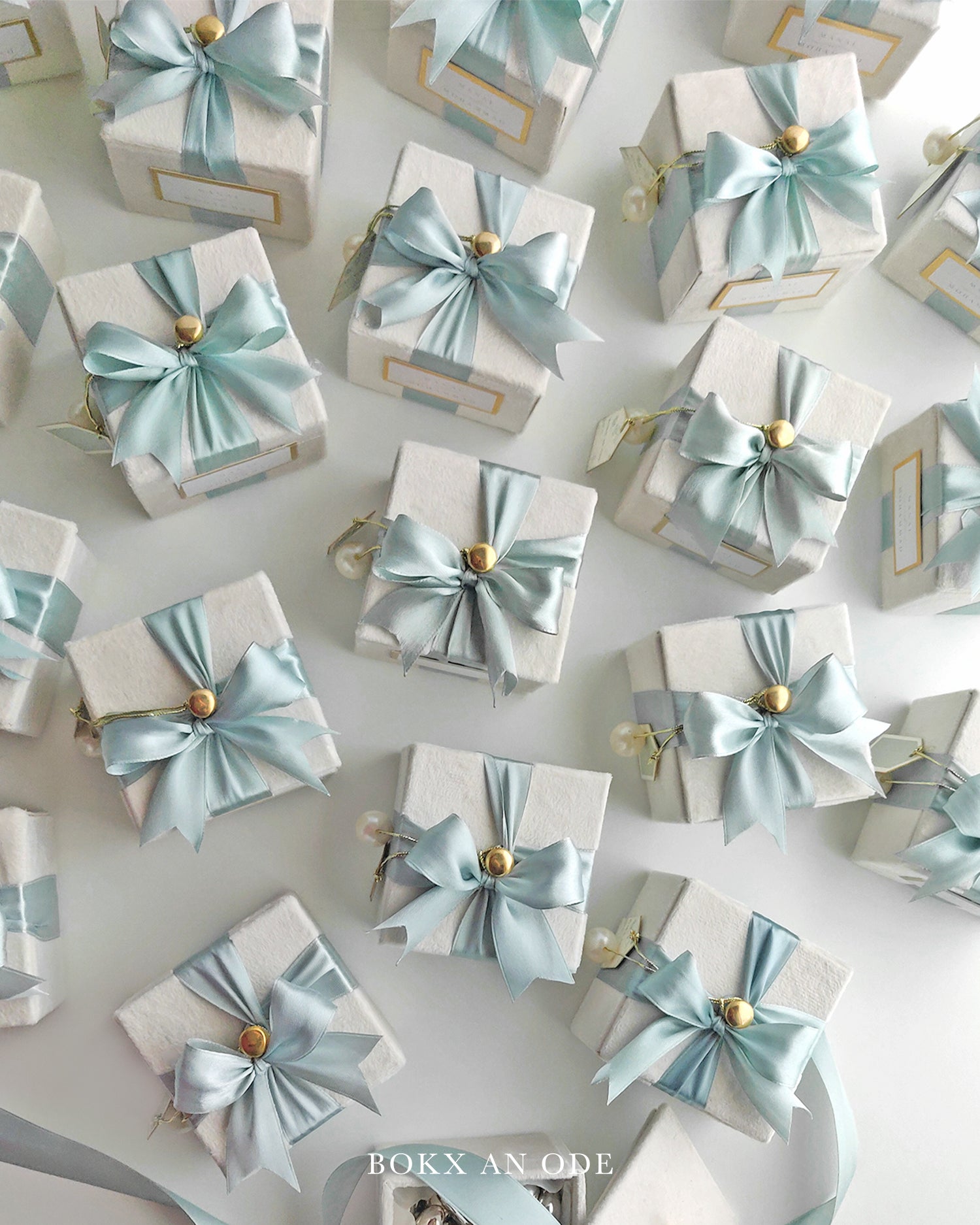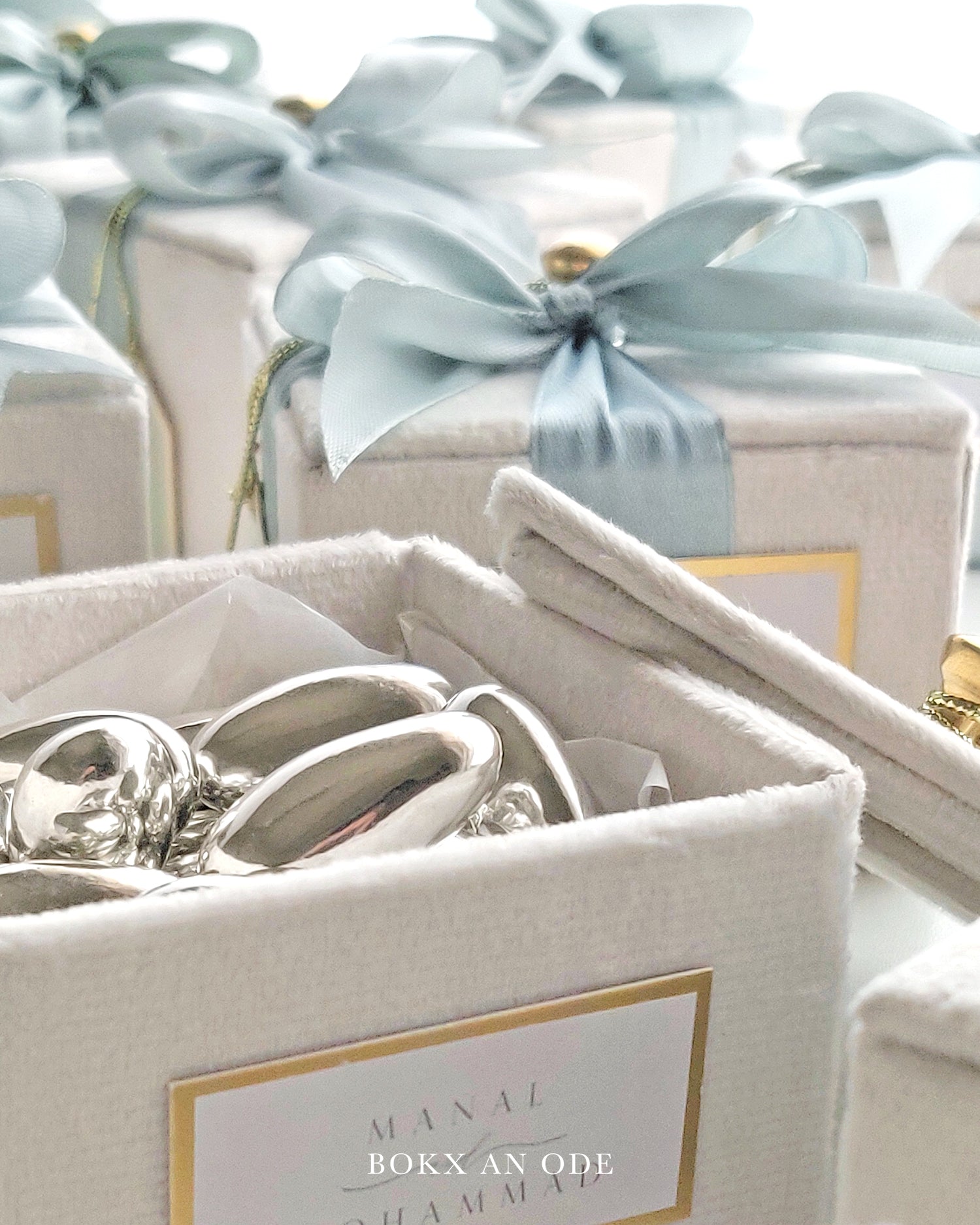 A decadent mini favour box made in plush Turkish suede velvet, adorned with a luxurious brass knob, dressed in satin ribbon. A placard with customised text placed on the front and hand tied string with a hanging pearl and a classic tag.