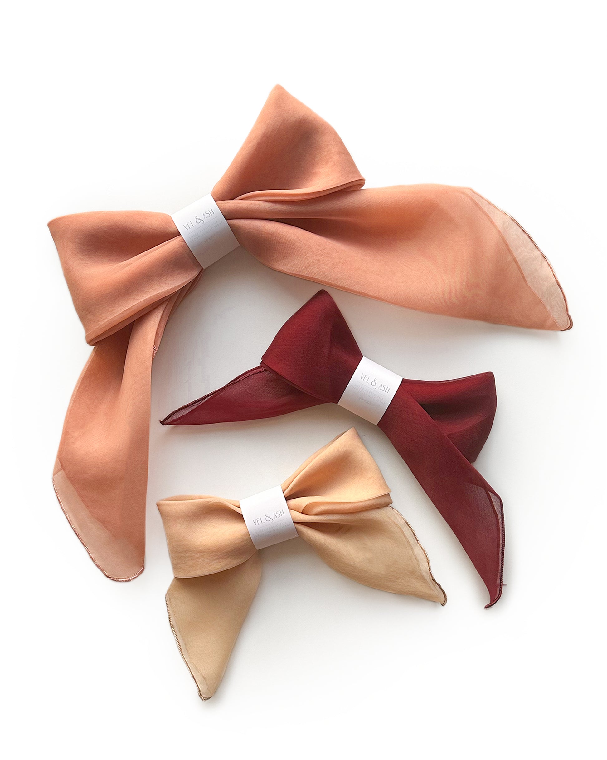 A set of 3 sheer organza dyed fabrics. The fabrics are double layered, square in shape and finished with an embroidered edge.